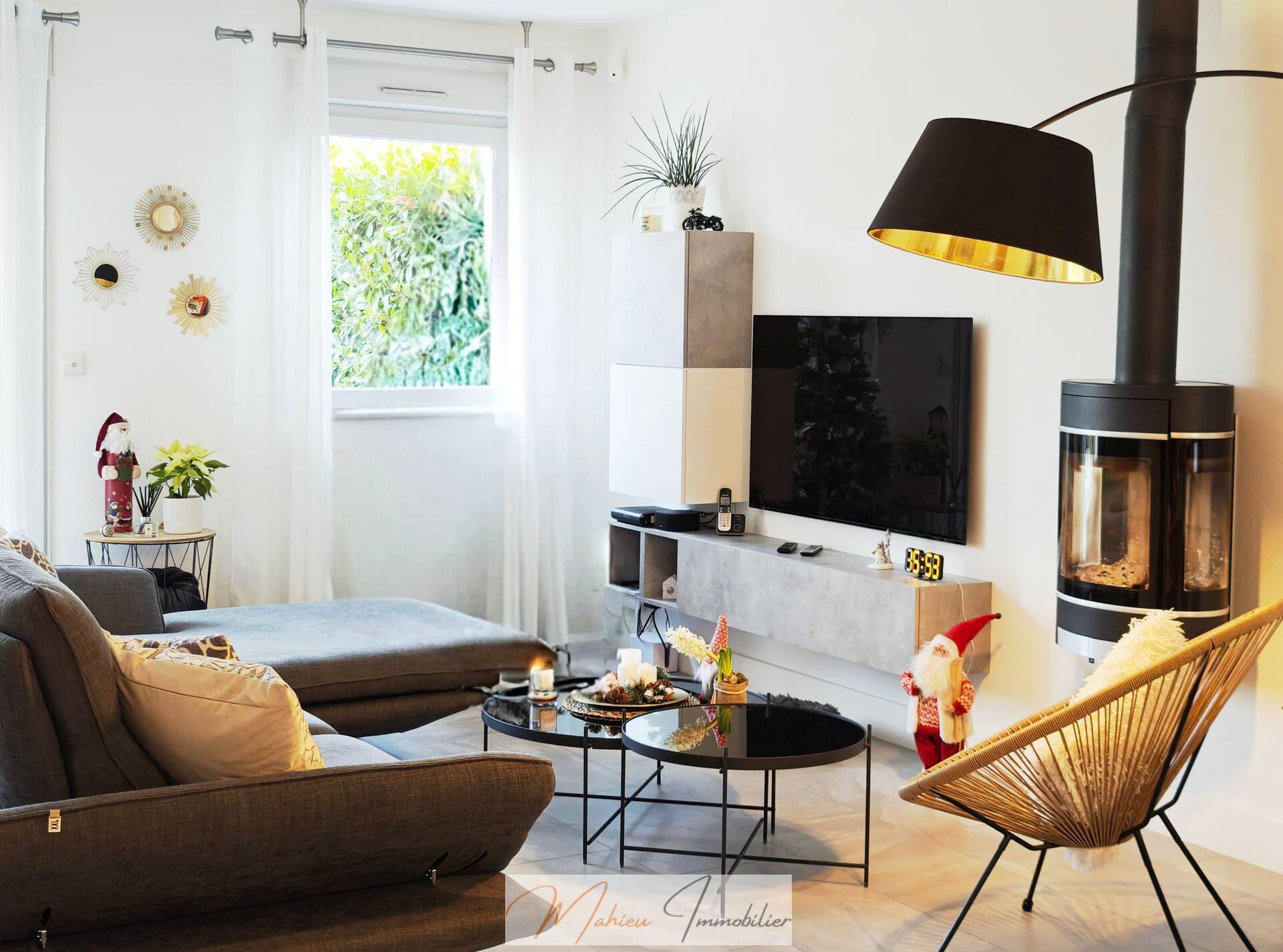 Le salon, cœur de la maison, est sublimé par un poêle à bois, créant une atmosphère chaleureuse, réconfortante et conviviale, idéale pour les soirées d’hiver.